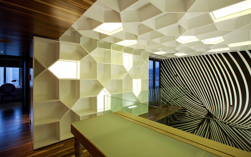 - 都市生活是快節(jié)奏的樂章,簡潔有力則是這篇樂章最相稱的和弦音。本案中設(shè)計(jì)師緊扣簡約、雅致的風(fēng)格調(diào)性,在開辟出強(qiáng)大的使用功能和儲物功能的同時(shí),對這個(gè)復(fù)式小樓重新做出戲劇性的布局: 開放式的廚房和加長的島臺使得家人、朋友可以盡享互動的樂趣;極富樂感黑白線條放肆的流動游走,白得極致的格子書柜貫穿二層的開放式書房甚至布滿整個(gè)天花;一個(gè)運(yùn)用清玻和黑色鏡鋼以及玉砂夾膠鏡搭建的跨越客廳上空的L形天橋,讓動靜分明的功能分區(qū)也由此而獲得自然的過渡,空間也因此有了極強(qiáng)的層次感。而那一抹極為耀眼的芥末黃更是變成了樂譜上跳動的音符,劃破了本來的寧靜,為這個(gè)家?guī)砹松畹膼倓?。精心的?gòu)思及巧妙的用色,使得整個(gè)空間宜動宜靜,樂活而又型格。